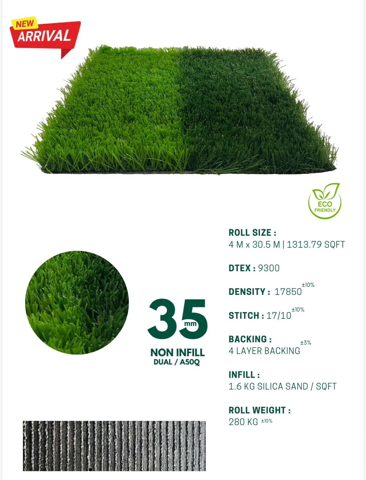 Bring home premium quality with 35mm Non-Infill Dual Turf (A50Q) from Evergreen Turf & Plants, Noida’s leading artificial grass supplier. Designed for landscaping, sports, and decorative purposes, this turf offers a lush, natural appearance with superior performance—without requiring any sand or rubber infill. Made using dual-tone green fibers, the 35mm turf provides a soft, comfortable feel while maintaining excellent resilience, drainage, and UV protection. Its dense, non-infill design ensures easy installation, making it perfect for gardens, balconies, terraces, play areas, and indoor spaces.