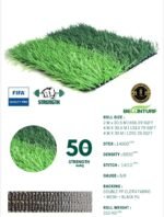 ROLL SIZE: 4 x 30.5 M (1313.79 SQFT) DTEX: 8000 ±10% PILE HEIGHT: 50 mm ±3% GAUGE: 5/8 inch STITCH RATE: 16/10 ±3% DENSITY: 10,080 stitches/m² BACKING: Double PP + Black PU |